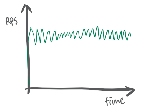서비스 스케일에 변화가 없다면, RPS는 테스트 내내 일정합니다. 저는 처음에 테스트 시간이 지날 수록 RPS가 늘어날 것이라고 생각했습니다만 이건 경기도 오산이었습니다. 어짜피 서비스가 1초에 처리할 수 있는 request의 수는 정해저 있습니다. 테스트를 오래 친다고 늘어나지 않습니다. 만약 테스트 중에 RPS가 올라가는 경우라면 다음 항목들을 의심해볼 수 있을 것 같습니다. * kubernetes based의 서비스이고, 테스트 도중 pod이 늘어났다. * DDB를 사용하고 있고, 테스트 도중 partition이 늘어났다. * 서비스가 죽어서 갑자기 fail response가 겁나 빠르게 들어온다. 다른 요소들이 있을 수 있겠다만, 저는 위 두가지 이유가 아니라면, 다음과 같은 그래프처럼 테스트 내내 꽤나 일정한 RPS가 나왔습니다.